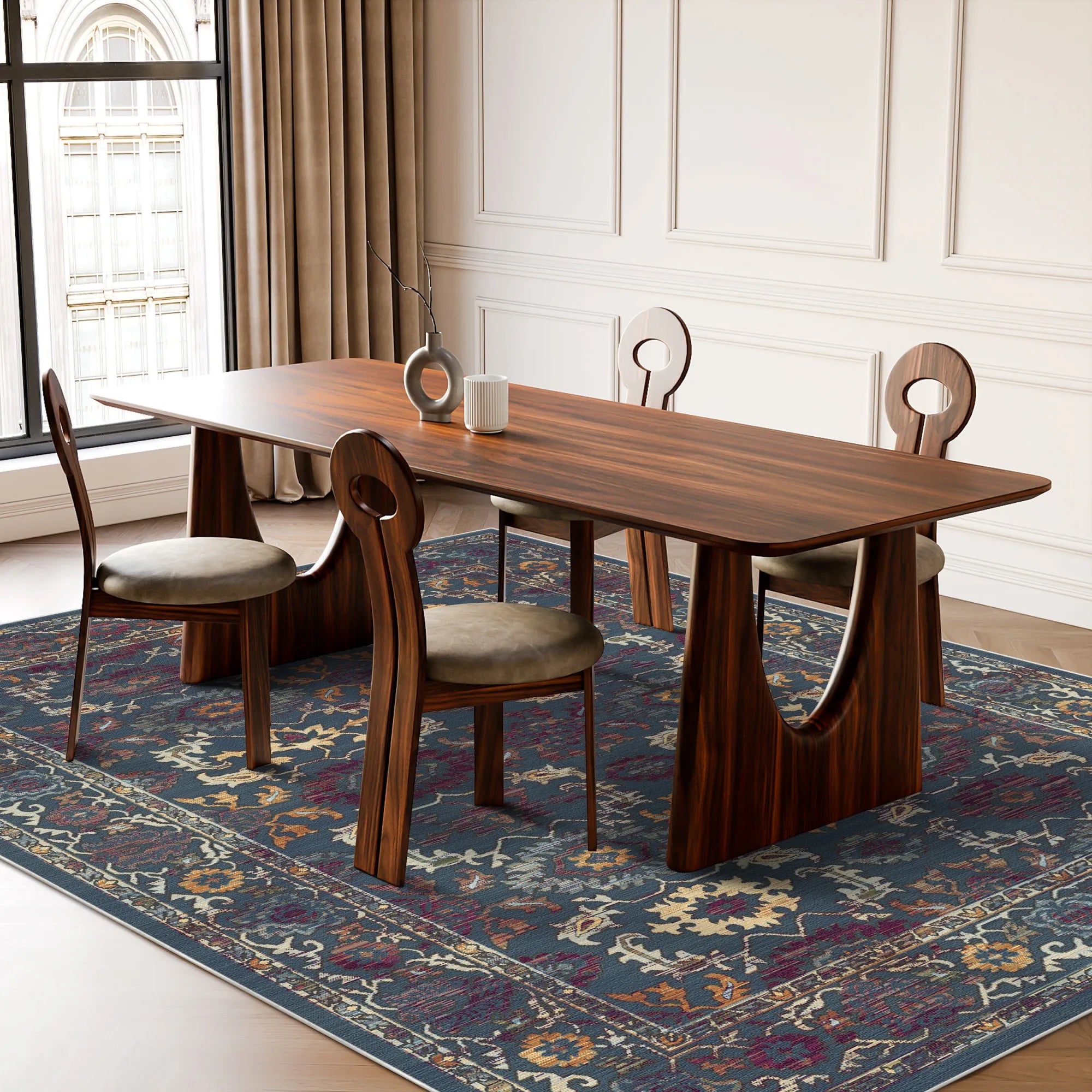 Modern luxury is defined by the seamless fusion of curated design and effortless maintenance. The Antique Indigo is fully machine washable, allowing you to easily refresh its deep, imperial colors and complex textures with a simple cycle in your home machine. Its sleek, low-profile construction is specifically optimized to be robot vacuum friendly, ensuring your automated cleaners glide seamlessly over the ornate ornamental borders without any interruption. This is more than just a floor covering; it is a durable, functional piece of art that invites the nomadic spirit and nomadic splendor of the East into your contemporary home, promising a beautiful and stress-free foundation for a curated lifestyle.