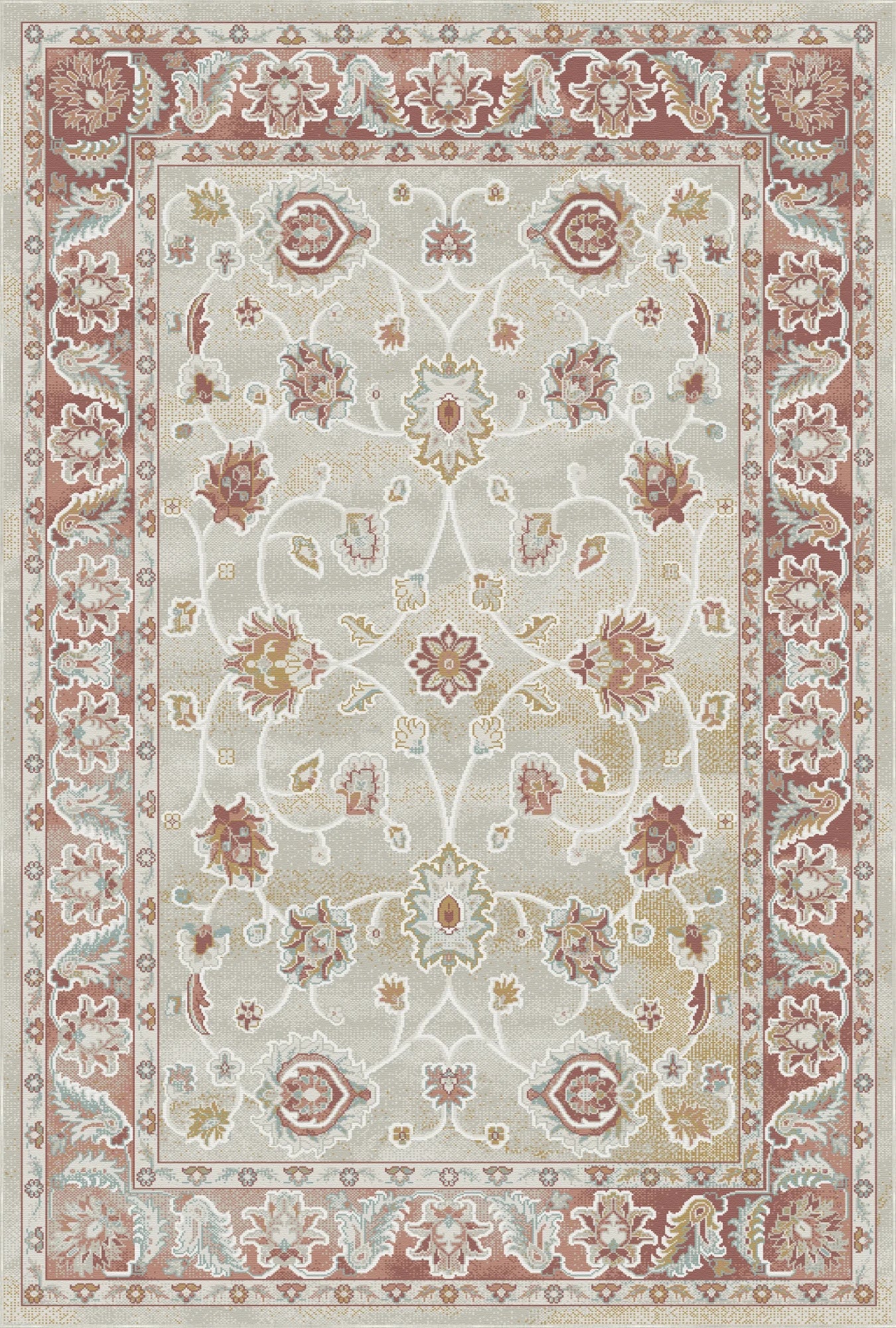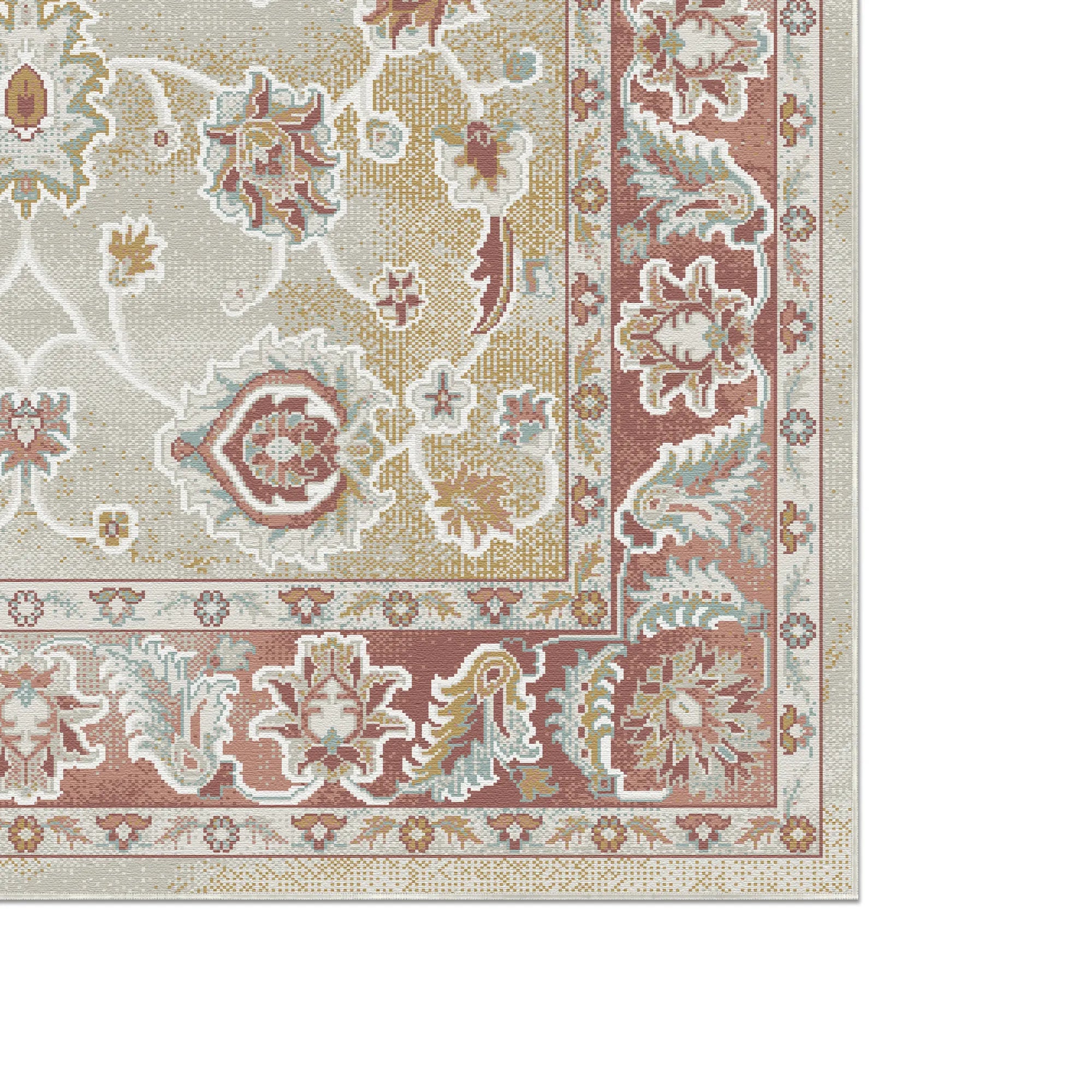 A Luminous Tapestry of Earthy Sophistication The Aura Scrolling Vine Terracotta rug is designed to bring a sense of organic warmth and classical balance to your home. This piece features a radiant ivory "open field" center that reflects natural light, making your room feel more expansive and airy. Upon this luminous base, slender scrolling vines and soft botanical palmettes in muted blue and gold are artfully scattered, offering a sophisticated "New Vintage" aesthetic. The entire composition is masterfully anchored by a grand, high-definition border in rich terracotta-rust, creating an architectural frame that defines the space with elegance and poise.