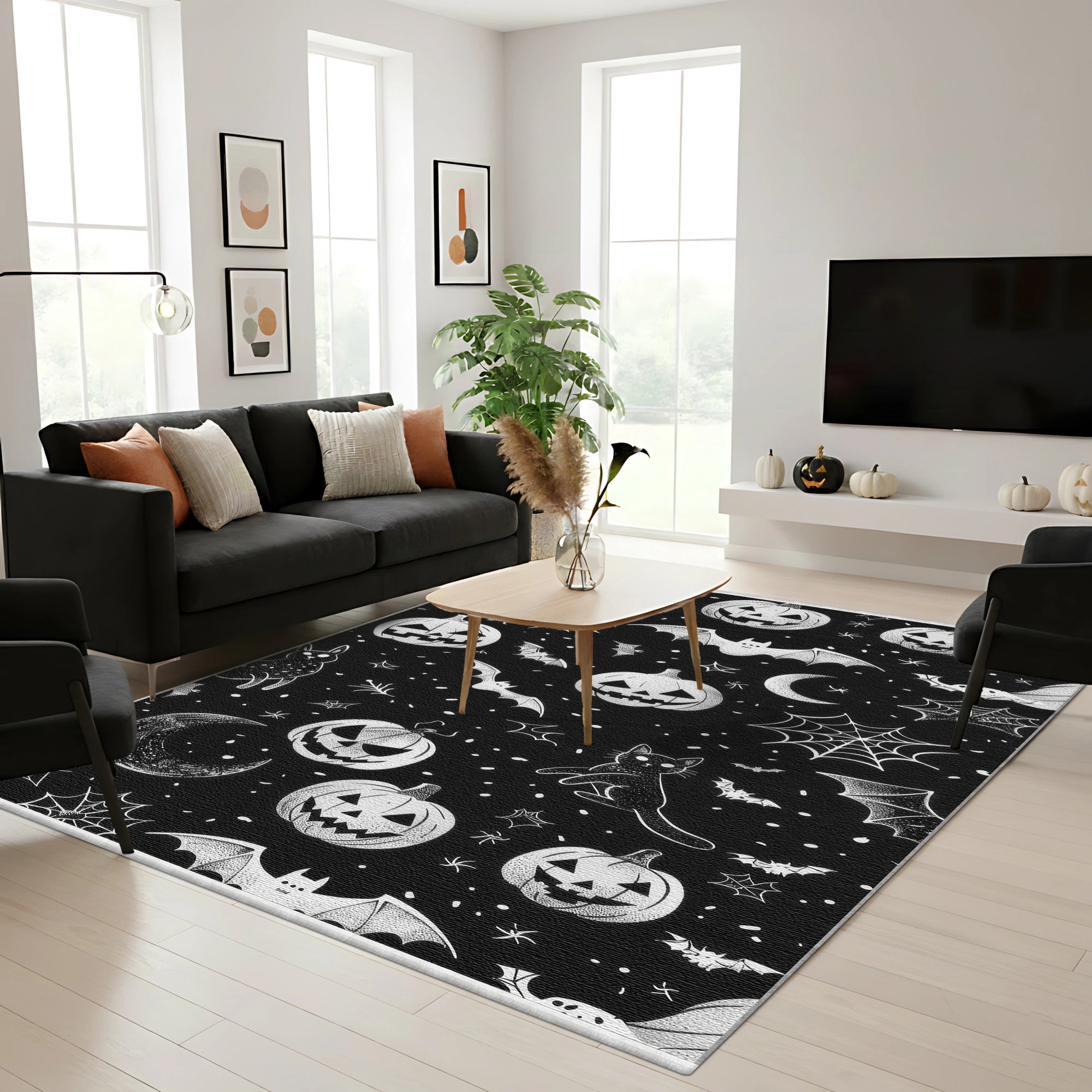 Add a touch of playful sophistication to your home with this unique Monochrome Cat Pumpkin Halloween Rug. The design features a charming, dense pattern of classic Halloween symbols rendered entirely in sharp black and white/grey tones against a textured dark background. The detailed pattern includes stylized black cats, various flying bats, crescent moons, intricate spider webs, and grinning jack-o'-lanterns. This high-contrast aesthetic makes it an ideal statement piece for a modern or traditional spooky setup.