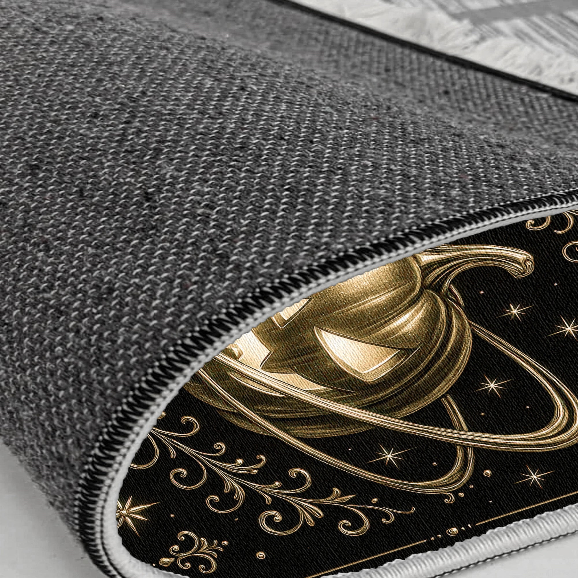 Elevate your holiday decor with this truly luxurious and mystical area rug, perfect for a sophisticated Halloween theme. The central focus is a captivating gold-toned carved pumpkin, dramatically encircled by cosmic, Saturn-like rings. Set against a deep, dark background, the design is framed by intricate gold scrollwork and sparkling stars, adding an elegant, gothic, and high-end feel. Constructed from durable polyester with a soft 0.3 in pile height, this rug is comfortable yet resilient. Its stability is ensured by the reliable cotton backing, and its fully washable nature guarantees that its opulent style remains effortless to maintain season after season.