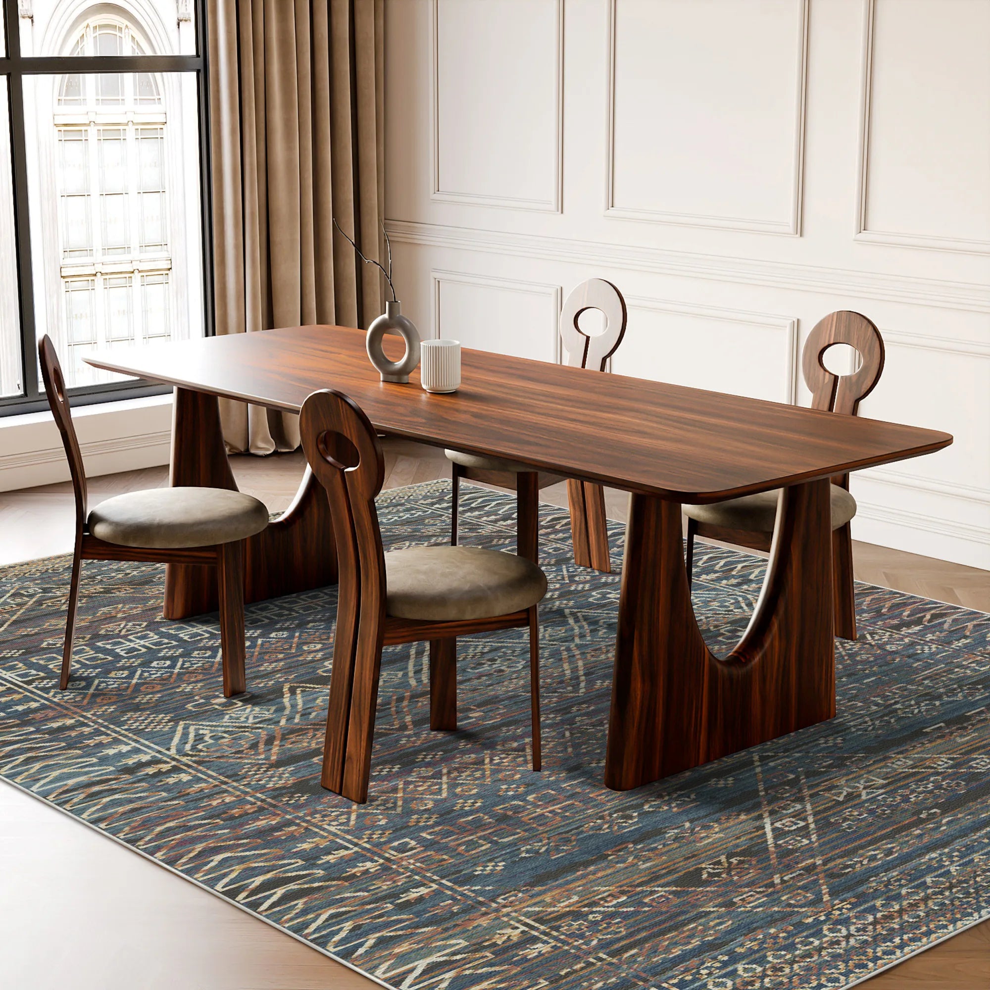 Masterfully engineered to marry this breathtaking "ink-washed" aesthetic with the rigorous demands of modern household life, the Indigo Oracle is woven from premium, high-density polyester fibers. This construction delivers a velvety, cloud-like touch underfoot while offering superior resilience against daily wear and tear. Our advanced color-lock technology ensures that the deep blues and earthy accents remain beautifully intense, wash after wash. For ultimate peace of mind, it features a high-grade, integrated slip-resistant backing that grips firmly to your hardwood or tile floors, ensuring the rug remains perfectly flat and secure without the need for additional pads. Fully machine washable and optimized for robot vacuum compatibility, this rug brings the timeless allure of a weathered, tribal masterpiece into your home with zero maintenance stress.