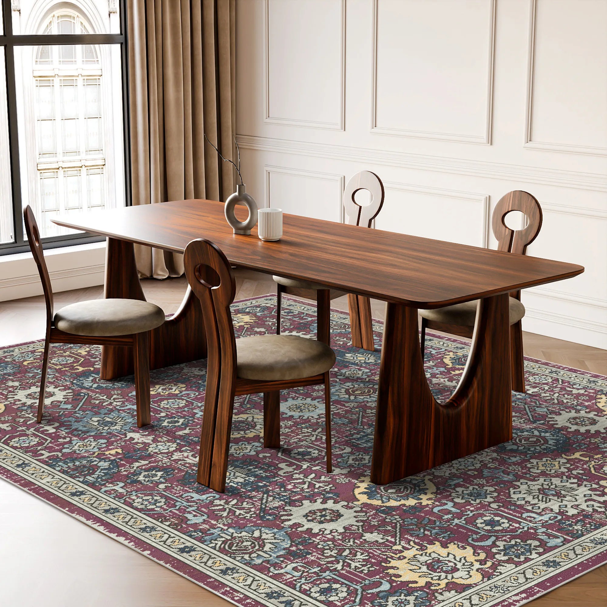 True modern luxury is defined by the seamless fusion of curated design and effortless maintenance. The Tribal Berry Medallion is fully machine washable, allowing you to easily refresh its deep berry tones and complex tribal textures with a simple cycle in your home machine. Furthermore, its sleek and low-profile construction is specifically optimized to be robot vacuum friendly, ensuring your automated cleaners glide seamlessly over the ornate geometric borders without any interruption. This is more than just a floor covering; it is a durable, functional work of art that invites the spirited energy and ancestral zarafet of tribal heritage into your contemporary home, promising a beautiful and stress-free foundation for a curated lifestyle.