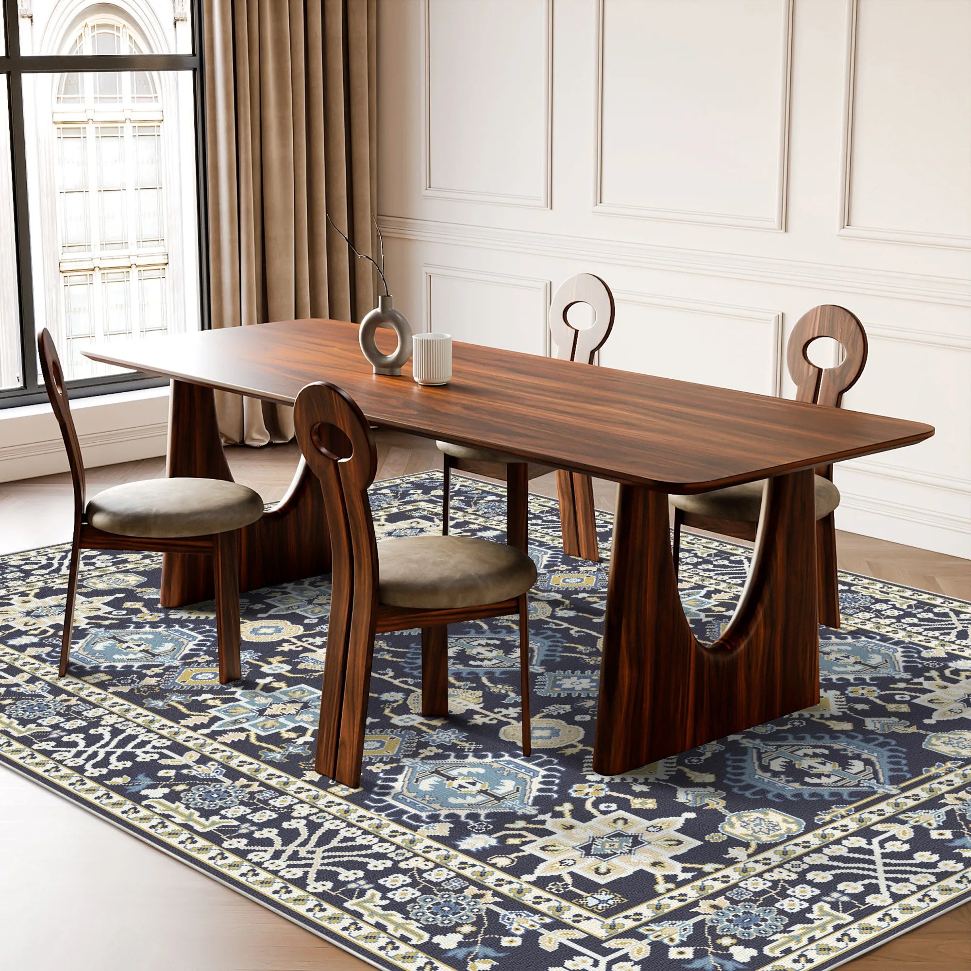 Masterfully engineered for the demands of an evolving home, the Vortex Obsidian Zenith is woven from premium, high-density polyester fibers that deliver a velvety, cloud-like touch underfoot while offering superior resilience. The dark, multi-tonal base is an expert practical choice, naturally masking daily shadows and pet activity, while our advanced color-lock technology ensures the crystalline blue and ivory highlights remain brilliant through years of use. For ultimate safety, it features a high-grade, integrated slip-resistant backing that grips firmly to your hardwood or tile floors, ensuring the rug remains perfectly flat without the need for additional pads. Fully machine washable and optimized for robot vacuum compatibility, this rug brings the timeless essence of artisan craftsmanship into your home with the ultimate ease of maintenance.